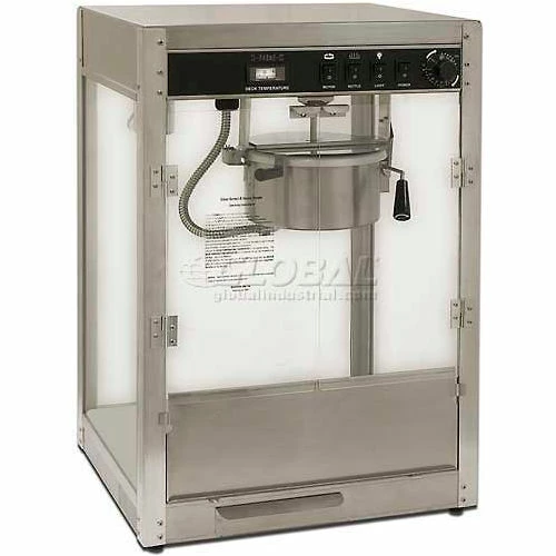 These models incorporate a separate cabinet thermostat and temperature indicator. This Benchmark innovation allows you to accurately control the heat in the food zone ensuring that your popcorn is always at the perfect serving temperature. Each Silver Screen model has a stainless steel cabinet and food zone insuring years of durability. This popper utilizes a hard-coat anodized, high thermal mass kettle for easy cleaning and superior performance. The four-switch configuration allows for any operating situation. Will work on a standard 15 amp circuit, so that it can be used anywhere without any additional electrical wiring. Old Maid Drawer has perforation in the bottom stainless tray which allows the un-popped kernels to fall into the drawer leaving only fresh and fluffy popped corn in the holding bin.