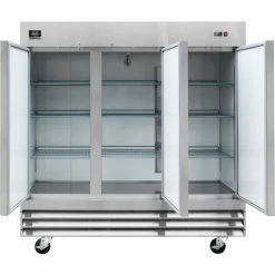 CABINET CONSTRUCTION Heavy duty construction includes exterior stainless steel on front, sides, door(s) and grille. Cabinet back and bottom are galvanized steel. Interior liner is made of corrosion resistant anodized aluminum. Interior thermometer is standard. Cabinets are insulated with 2″ thick foamed-in-place polyurethane insulation. Sub-top insulated with 1-1/2″ foamed-inplace polyurethane insulation. Doors are mounted to cabinet on self-closing, cartridge style hinges with 120° stay open feature. Door openings include low voltage, anticondensate heaters. Doors are equipped with a snap-inplace vinyl magnetic gasket for positive seal. Convenient, double pull style door handle is made of black anodized aluminum. 6″ high casters are standard, 2 include brakes. An 8′ cord set is provided with 115 volt models. Cabinet interior standard with 2 steel wire epoxy coated shelves per section.