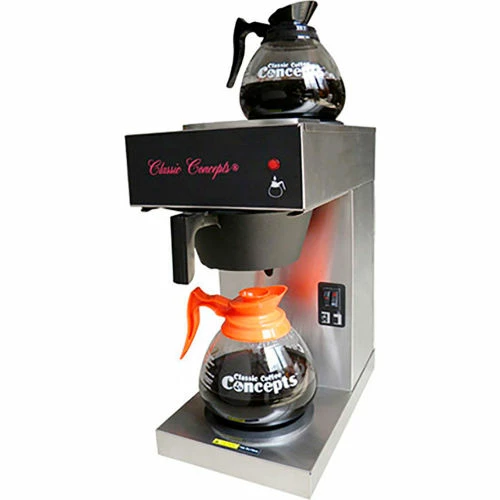 Features easy-to-clean stainless steel exterior and two warming plates. This energy efficient unit allows you to pour water into the tank as needed, eliminating a water reservoir so each pot is brewed fresh. Each warming plate comes equipped with its own lighted on/off switch.