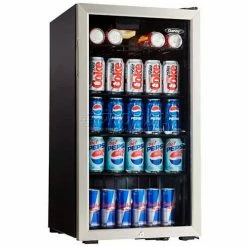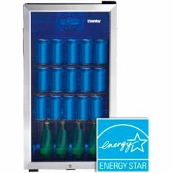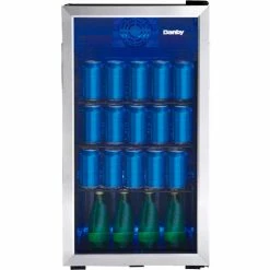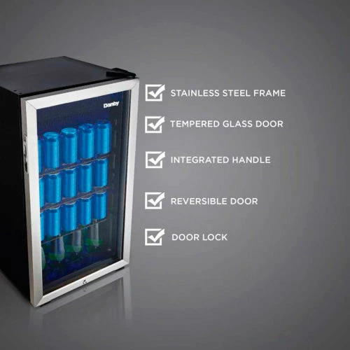 Mini fridge designed to store beer, pop and a variety of other drinks. This unit is a convenient yet modern option for anyone looking to enhance their hosting space. Whether you’re updating your wet-bar or adding extra drink storage to your basement, this Danby beverage cooler offers compact versatility with its adjustable wired shelves and blue LED lights. The smooth back design allows for flush installation near a wall, and the reversible door hinge allows you to adjust for either left or right-handed door opening. Additionally, this unit features an easy to use mechanical thermostat, with a temperature range of 2 to 10 C (35.6F 50F). With its sharp clean lines, this mini bar fridge is designed to blend with any decor style seamlessly.