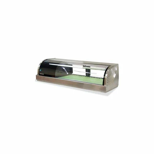 Refrigerated display case has a practical and attractive curved front glass window, reducing glare and maximizing space. The front glass also angles down for easy cleaning. Large diameter drains along the front, NSF-approved thermometer. Durable and attractive stainless steel exterior. Self contained refrigeration unit roe easy installation. Condenser features a larger face area that greatly improves airflow and cooling performance, Food plates feature radius grooves to fit typical sushi products and can be turned upside down to further improve cooling