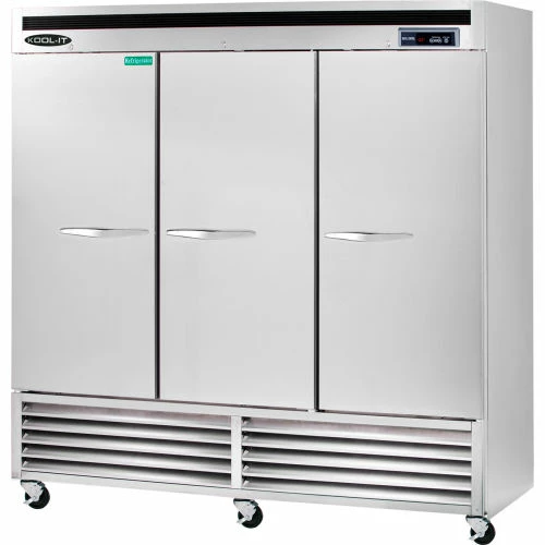 The Kool-It Bottom Mount 3-Section Reach-In Refrigerator has 3 solid stainless steel doors. The unit includes 9 shelves that can accommodate full-size sheet pans. Includes heavy duty 4″ casters w/ 2 front brakes. The bottom mount refrigerator is ETL / ETL Sanitation, and Energy Star® rated.
