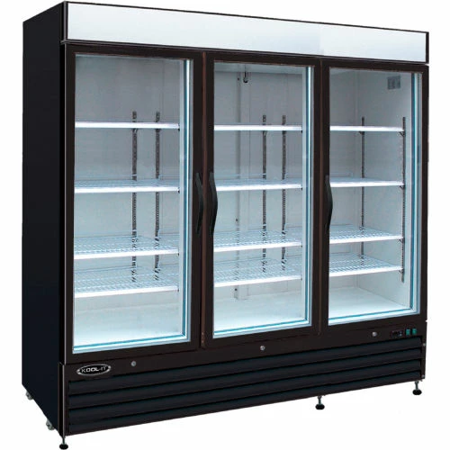 Kool-It Freezer Merchandiser with locking, double pane glass, self-closing door. Holds at -10°F temperature with digital display. White interior with adjustable shelves, fluorescent interior lighting, top lighted signage panel, black exterior, adjustable feet, bottom mount self-contained refrigeration. 115V, cETLus, ETL-S, and Energy Star® rated.