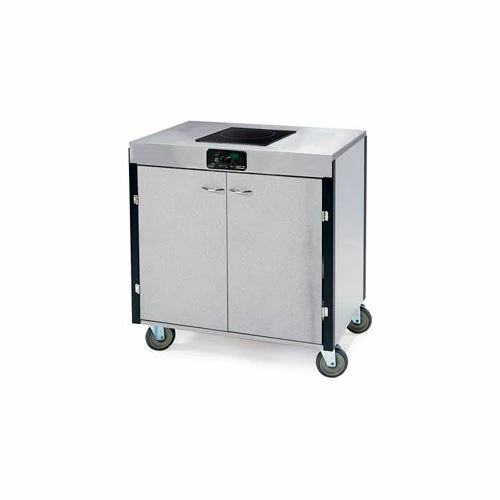 Perfect for any indoor location.Attractive, durable and practical design.Top is heat resistant stainless steel.Exterior is durable laminate, available in attractive finishes.Interior is easy to clean and sanitize stainless steel.Stainless steel interior shelf provides convenient storage for ingredients and supplies. Induction stove features state-of-the-art cooking that is energy efficient, safe and has no flame or heat on the cooking surface. Optional sneeze guard and demonstration mirror available. 5″ (127 mm) No-Mark cushion tread casters.