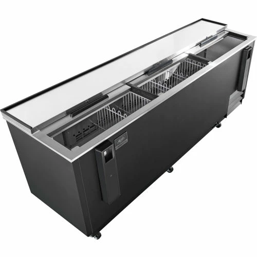 The Nexel® Horizontal Bottle Cooler keeps beverages cool and ready to serve. This unit is perfect for bars, cafes, and other areas that service drinks from behind a counter. This cooler holds up to 3 sliding lids and 4 dividers to organize beverages and packaged items that need to be kept cold. The unit allows temperature adjustment from 33 – 41 degrees Fahrenheit to keep beverages at their optimal temperatures. Solid sliding doors protect and provide privacy of contents from the outside. Durable stainless steel construction withstands vigorous crate usage.