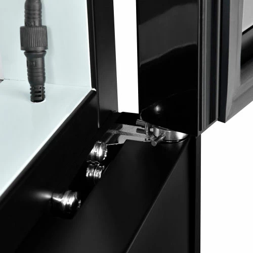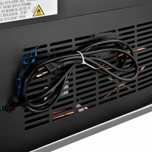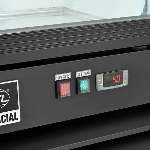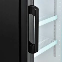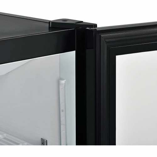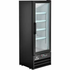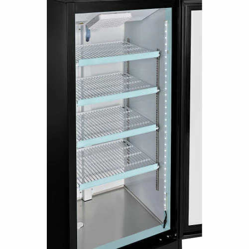 This merchandise refrigerator ensures a temperature controlled environment while conveniently displaying food and beverages for food service, commercial, retail, and other related applications. The powder coated steel exterior construction is both strong and corrosion resistant providing years of dependable service. The double pane, single glass door offers full content access, high visibility, and energy efficiency. The 4 PVC coated wire shelves allow convenient content storage while reducing required maintenance. The aluminum interior includes bright, long-lasting LED lighting for high visibility. The bottom mount compressor is designed to be easily serviced and allows for light duty storage on top of the unit. Includes front panel temperature controls and power switches for convenient user access. 8′ power cord. Temperatures range from 33 – 40°F. Color: Black. NSF Certified.
