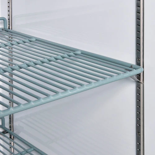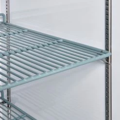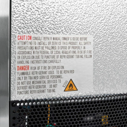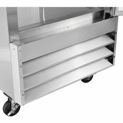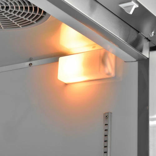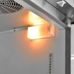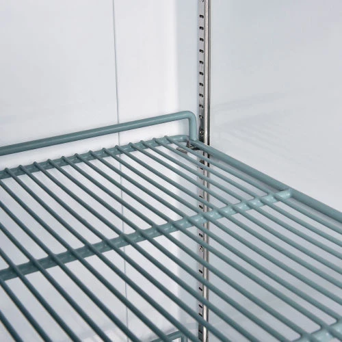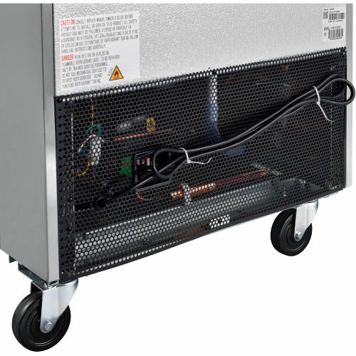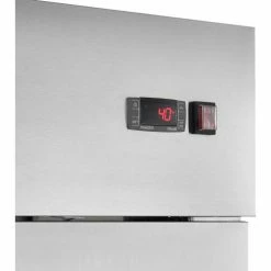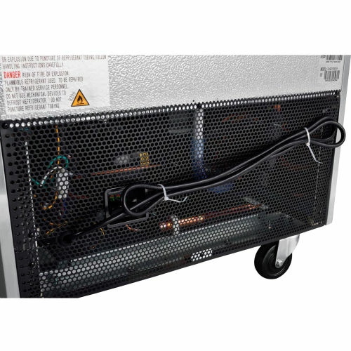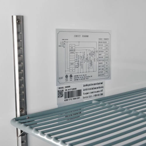 Commercial grade reach in freezer is durable and spacious. Constructed of stainless steel exterior and aluminum interior for long life and easy cleaning. Solid door has easy grip recessed handle. Unit includes 3 adjustable PVC coated steel shelves for versatile storage needs and bright incandescent interior lighting. Exterior digital temperature controls offer precise and constant temperatures ranging from -8 to 0°F. R290 refrigerant offers low environmental impact and excellent thermodynamic performance. Bottom mounted 1/2 HP compressor allows for easy servicing. Unit rolls easily on 3″ swivel polypropylene casters, 2 with brakes. 23 cubic ft. capacity. Interior dimensions: 24.4″W x 27.1″D x 53.5″H.