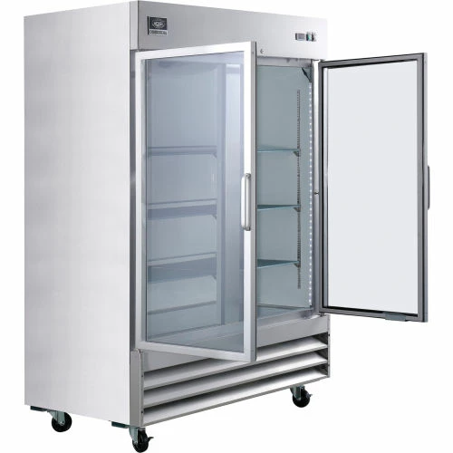 The Nexel® Reach In Refrigerator is a convenient and easily accessible choice for cold food storage. Equipped with two transparent glass doors, durable stainless-steel construction, and PVC wire-coated shelving, this refrigerator is ideal for storing perishable goods in restaurants, kitchens, and cafeterias. The embedded digital thermostat with LED display makes it easy to adjust to impressively below freezing temperatures, ensuring your foods and drinks stay fresh over time.