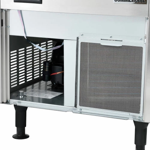 The Nexel® Air Cooled Under Counter Ice Machine produces up to 280 lbs. of high quality, crystal-clear full cube style ice per day making it suitable for any bar room, industrial kitchen, or similar foodservice station. This self-contained ice bin operates on an easy-to-use control panel for completely intuitive control. Each model features a 80 lb. ice capacity with automatic overflow prevention to prevent spillage. Stainless steel construction with durable plastic bin door provides a traditional appearance to accommodate restaurant and industrial kitchen stations. Unit includes ice scoop, water filter, and drain hose. Front access panel for quick maintenance checks. Adjustable legs to accommodate for uneven flooring. Suitable for freestanding or built-in applications. ETL approved for commercial use. 1 Year Limited Warranty.