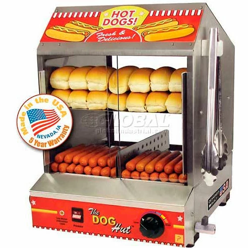 Heavy-duty 20 gauge stainless steel construction makes The Dog Hut the most durable steamer and it accommodates up to 200 hot dogs and 42 buns. Removable product trays and sliding doors allow for easy access to hotdogs and buns and makes for simple easy clean up. The proprietary heating system featuring heavy-duty submersible stainless steel element and automatic shutoff feature when water gets below a certain level. The oversized eight quart water reservoir is the largest available for extended holding times. Plus, the quick turn water release valve eliminates burned fingers and spilled water.