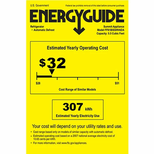 Inside, the FF61BISSHVADA utilizes automatic defrost operation to ensure minimum user maintenance. The 5.5 cu.ft. interior offers more storage space than most models in this size class. Adjustable glass shelves ensure spill-proof storage, while a large crisper drawer is ideal for keeping produce at its best. A removable wine shelf lets you keep bottles securely in place. The door includes three storage racks for condiments and tall bottles. The seamless interior also features a dial thermostat and automatic light.