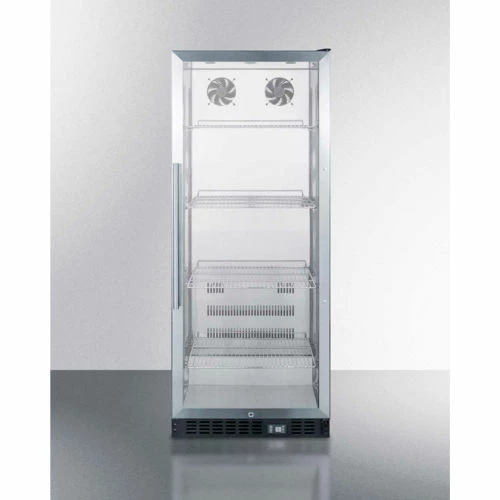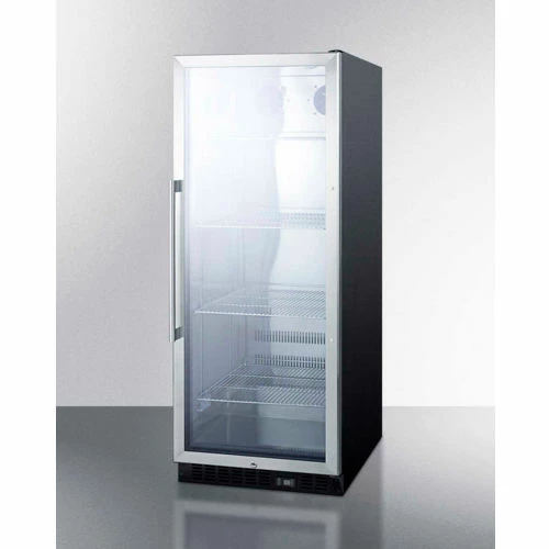 SUMMIT’s commercially approved beverage merchandisers are designed for durable service, convenient use, and attractive presentation. Our SCR series of all refrigerators are sized with large capacities but space-conscious dimensions. The SCR1156 offers 11 cu.ft. of room in a thin-line width under 24″. A glass door provides maximum visibility of products on shelves that go all the way down to the floor. Full automatic defrost makes maintenance easy and stress-free while a tropicalized design keeps contents preserved safely, even when the unit is placed in a hot temperature. Other convenient features include an interior fluorescent light, adjustable thermostat, factory installed lock, and adjustable slide-out shelves for flexibility in storage. Commercially approved and built for heavy duty use, the Energy Star certified SCR1156 offers an ideal way to sell and store cold products.