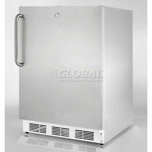 SUMMIT’s commercially approved FF7LADACSS is an elegant all-refrigerator designed for built-in installation under lower ADA counters.With a width just under 24 inches, the FF7LALCSS is perfect for any tight space, with a 32 inch height to meet ADA guidelines. Designed for built-in or freestanding use, this unit is fully wrapped in stainless steel for a luxurious look with maximum durability. A curved towel bar handle in brushed stainless steel adds modern style with an easy-to-grab fit. A front-mounted lock is included. Inside, the FF7LADACSS uses automatic defrost to lower user maintenance. SUMMIT’s unique “hidden” evaporator is set behind the rear wall, creating a seamless interior that’s easy to clean with no tricky crevices to trap food. The generous storage capacity and flat door liner can accommodate large trays with dimensions of 19 1/2″ x 16.” A rocker switch to turn the interior light on and off is located just behind the adjustable thermostat for additional convenience.User-friendly and energy efficient, the FF7LADACSS fits well in any commercial, home, or medical setting. Match it with a frost-free SCFF55ALCSS freezer for a complete side-by-side set.
