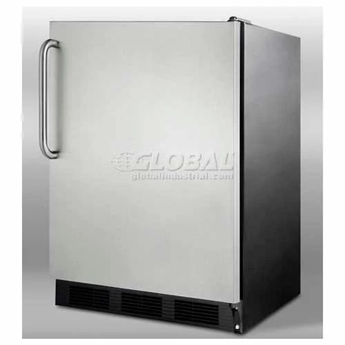 SUMMIT’s FF7ADA series features commercially approved all-refrigerators with ideal dimensions that offer maximum storage capacity in a slim fit. The freestanding FF7BSSTBADA is just under 24 inches wide to fit easily in tight spaces. It has a 32 inch height to meet ADA guidelines for lower counter height. The black cabinet is fitted with a wrapped stainless steel door for modern elegance, with a curved towel bar handle finishing the look. Inside, the FF7BSSTBADA uses automatic defrost to lower user maintenance. SUMMIT’s unique “hidden” evaporator is set behind the rear wall, creating a seamless interior that’s easy to clean with no tricky crevices to trap food. The generous storage capacity can accommodate large trays with dimensions of 19 1/2″ x 16.” Adjustable glass shelves add storage flexibility. A rocker switch to turn the interior light on and off is located just behind the adjustable thermostat for additional convenience. User-friendly and energy efficient, the FF7BSSTBADA fits well in any commercial, home, or medical setting. Match it with any frost-free SCFF55BADA freezer for a complete side-by-side set.