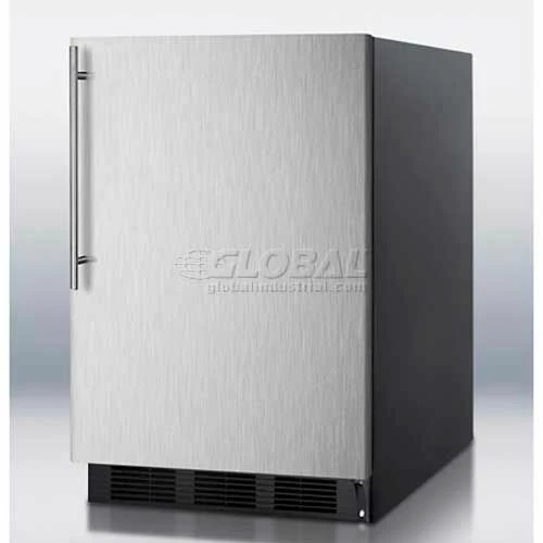 SUMMIT’s FF6B7SSHV commercial all-refrigerator offers full capacity inside a slim 24″ footprint. This ETL-S listed unit is designed for freestanding commercial use. It has a black cabinet and stainless steel wrapped door. A sleek vertical handle completes the professional look. The 5.5 cubic feet. interior includes adjustable glass shelves, door storage, a crisper drawer and interior lighting. Automatic defrost saves on maintenance and SUMMIT’s original “hidden evaporator” creates a seamless interior for easy cleaning. For a matching frost-free commercial freezer, see the SCFF55BSSHV.