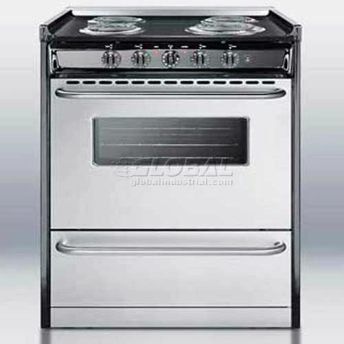SUMMIT PROFESSIONAL brings luxury to apartment sized ranges with our exclusive line of ‘slide-in’ ovens. The TEM210BRWY electric range is conveniently sized at 30″ wide to fit common kitchen spaces. Elegant stainless steel doors on the oven and lower storage compartment are matched with solid towel bar style handles. Our ‘slide-in’ units have a low stainless top frame that lets you customize the wall behind your range without planning around a backguard. A stainless steel manifold completes the modern look. Solidly constructed from black porcelain and steel, the TEM210BRWY is easy to clean and striking to view. The oven has a clear window and light so you can keep a watch on your cooking. Enjoy the best meals in unique style with lasting durability.
