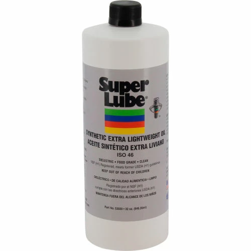 Super Lube synthetic extra lightweight oil is an ISO-46 multi-use oil with well-balanced performance in a range of applications. It exhibits excellent performance in high pressure vanes, piston and gear pumps, providing longer and optimum performance. It has excellent oxidation resistance, separates readily from water, resistant to foaming, allowing extension of oil filter intervals while assuring a clean system. Super Lube extra lightweight oil is an NSF registered food grade lubricant, rated H1 for incidental food contact. Made in the USA. Shelf Life of 5 Years. Case Quantity of 12. Warranty is 24 months from date of purchase.