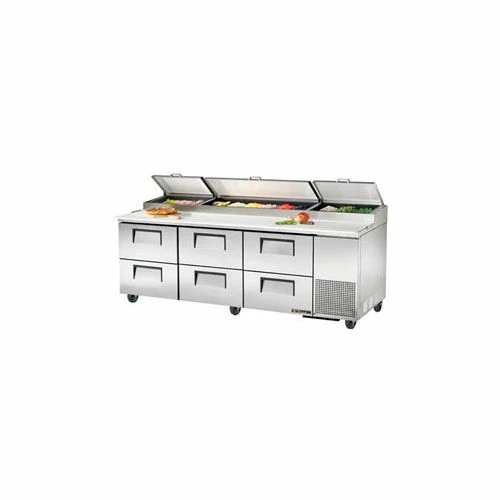 Pizza Prep, 33-41°F pan rail, s/s cover, 19.5″D cutting board, s/s front, top & sides, (6) drawers accommodates (2) 12″x20″x 8″D pans (NOT included), white interior w/300 stainless steel floor, 5″ castors, front breathing, 1/2 HP, 115v/60/1-ph, NEMA 5-15.