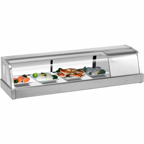 Refrigerated Case is self-contained and made with a beautifully curved, angled down top front glass. Refrigerator maintains 35 to 41°F for food preservation. Type 304 stainless steel solid food plates and exterior body with tempered glass doors. Plastic door handles on chef side for easy access. Includes NSF approved thermometer. 1″ diameter drain hole with plastic cover and tilted bottom for improved drainage. Side mounted 1/6HP compressor for ease of service. 115V. ETL listed. 48-13/16″W x 14-1/8″D x 11-1/2″H Overall Dimensions.